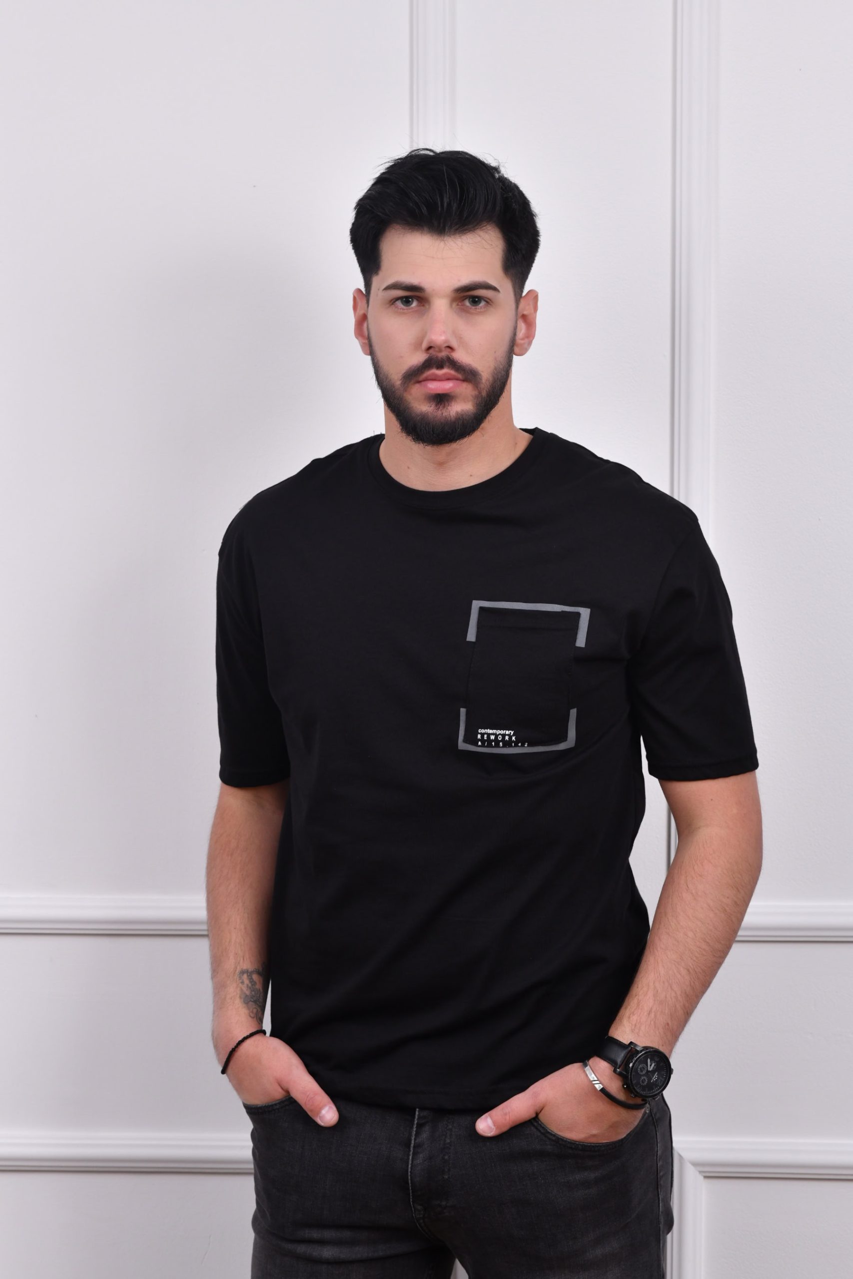 Crna muška majica sa printom na džepu